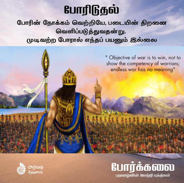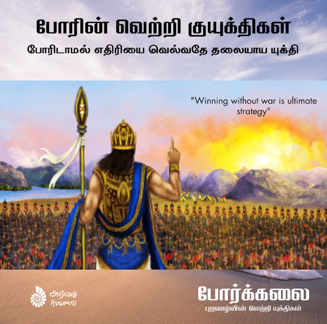Porkkalai is translation of “The Art of War” by Sun Tzu in Tamil language; it is one of the oldest classics from Chinese Literature used even today in field of military, business strategy and many more. Sun Tzu’s thought-provoking ideas can be very well applied to Management of people and to win in competitive environments. Various countries have adopted & researched to apply Sun Tzu’s Principles in defining Strategies and Management. Sun Tzu’s Principle from Author’s perspective below.